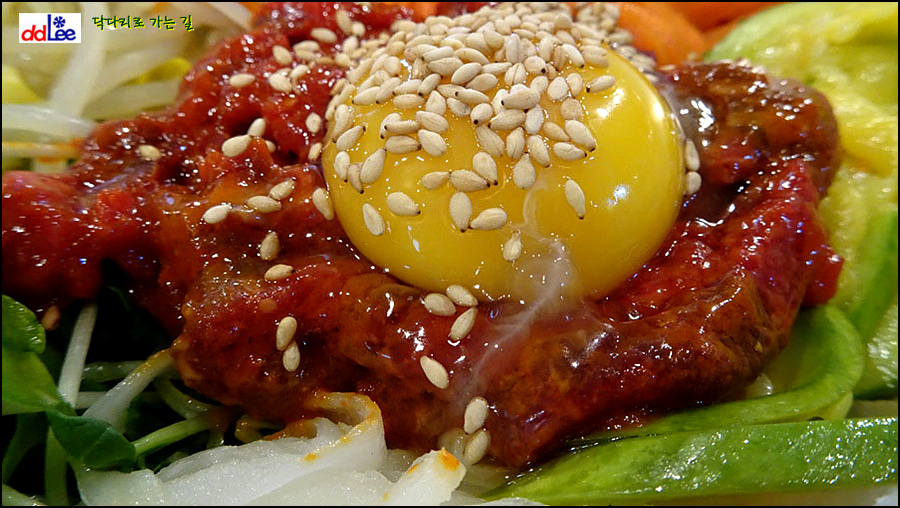 육회비빔밥은 오늘도 호박, 당근, 콩나물, 어린싹, 무채 위에 육회를 얹어놓고 노른자로 머리 올리고 나왔습니다.
